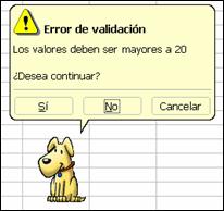Si la regla es de advertencia, Excel mostrará un cuadro de dialogo (con un mensaje predeterminado optativo que el usuario puede indicar previamente) y dará al usuario la oportunidad de rehacer la entrada (Figura 34)