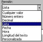 La validación de datos es tan rígida o flexible como el usuario la plantee. Puede especificarse el tipo de datos permitidos como se presenta en la Figura 32.