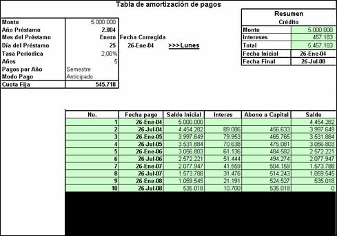 Aquí es claro que se tiene un préstamo de 5’000.000 a 5 años con pago semestral, se deben realizar 10 pagos, usted puede ver que en la tabla no se presenta ni información ni ceros del periodo 10 en adelante