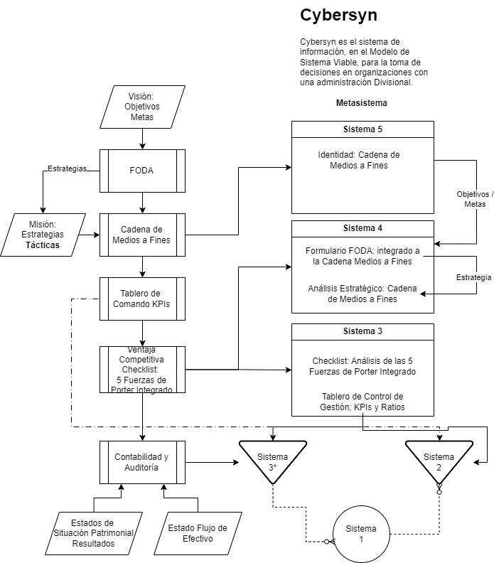 - Sala de Operaciones Cybersyn (Modelo de Sistema Viable): En este móduulo se representa al Sistema 5 - Identidad y Política (Propósito), que define los Fines Últimos. Qué somos y por qué existimos; al Sistema 4 - Inteligencia y Adaptación, dando la mirada externa hacia el futuro). Oportunidades y Metas; Sistema 3 - Control y Cohesión Operativa, indicando la gestión del 'Aquí y Ahora'. Fortalezas y Recursos Clave; y al Sistema 2 - Canales y Estabilización, coordinación de los ratios para controlar y evitar oscilaciones. (Sala de Operaciones Cybersyn).