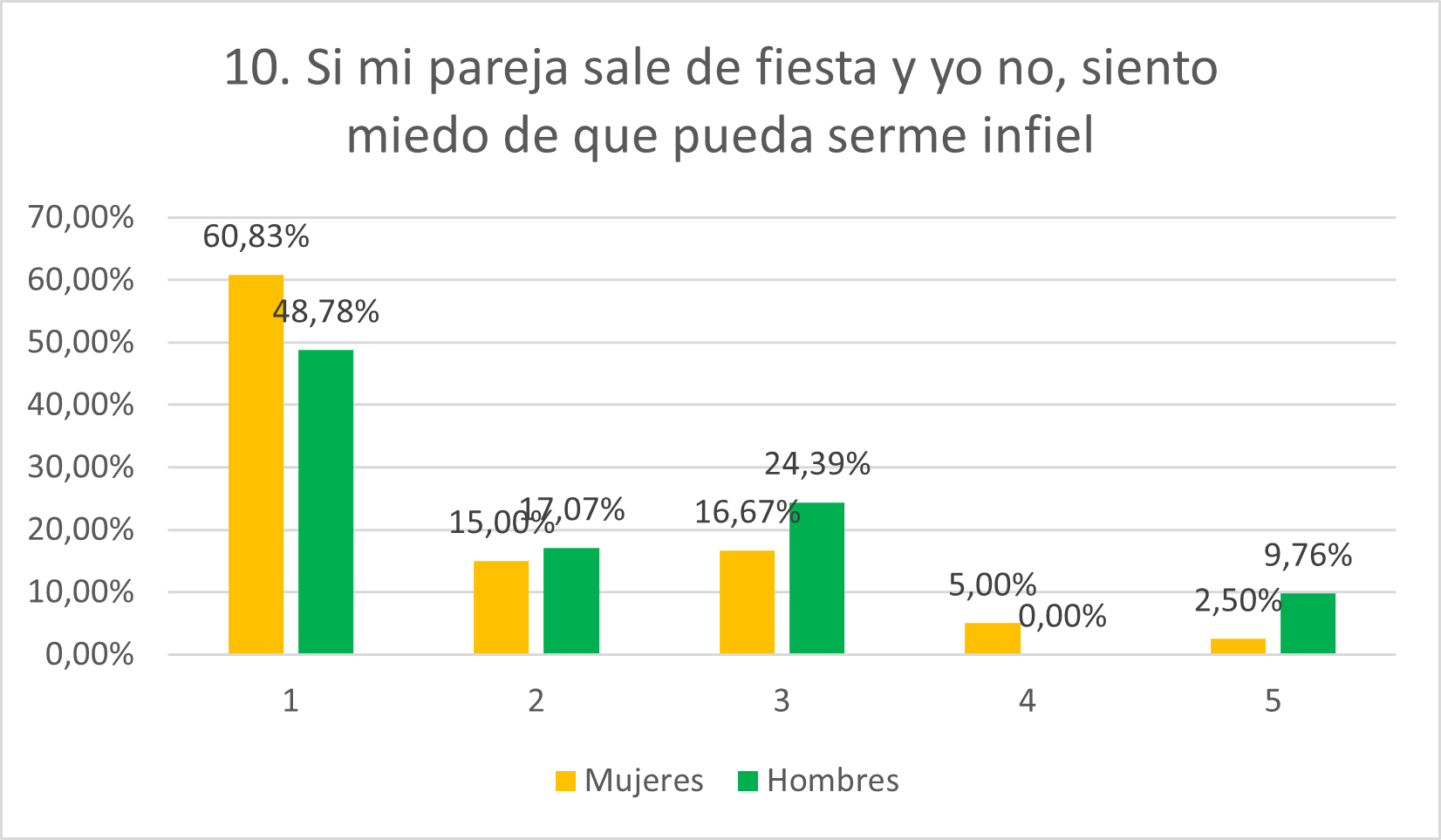 Tal y como se hipotetizaba, las tendencias en las respuestas de hombres y mujeres son similares. La mayoría (60,83% y 15% de mujeres y 48,78% y 17,07% de hombres) se encuentran en 1 y 2. Aunque un porcentaje notable de hombres muestra más desconfianza al estar totalmente de acuerdo (9,76%). También es mayor el porcentaje de hombres que se muestra neutral (24,39% frente a 16,67% en mujeres). Esto refleja mayor grado de posesividad, inseguridad y desconfianza por parte de los hombres.
