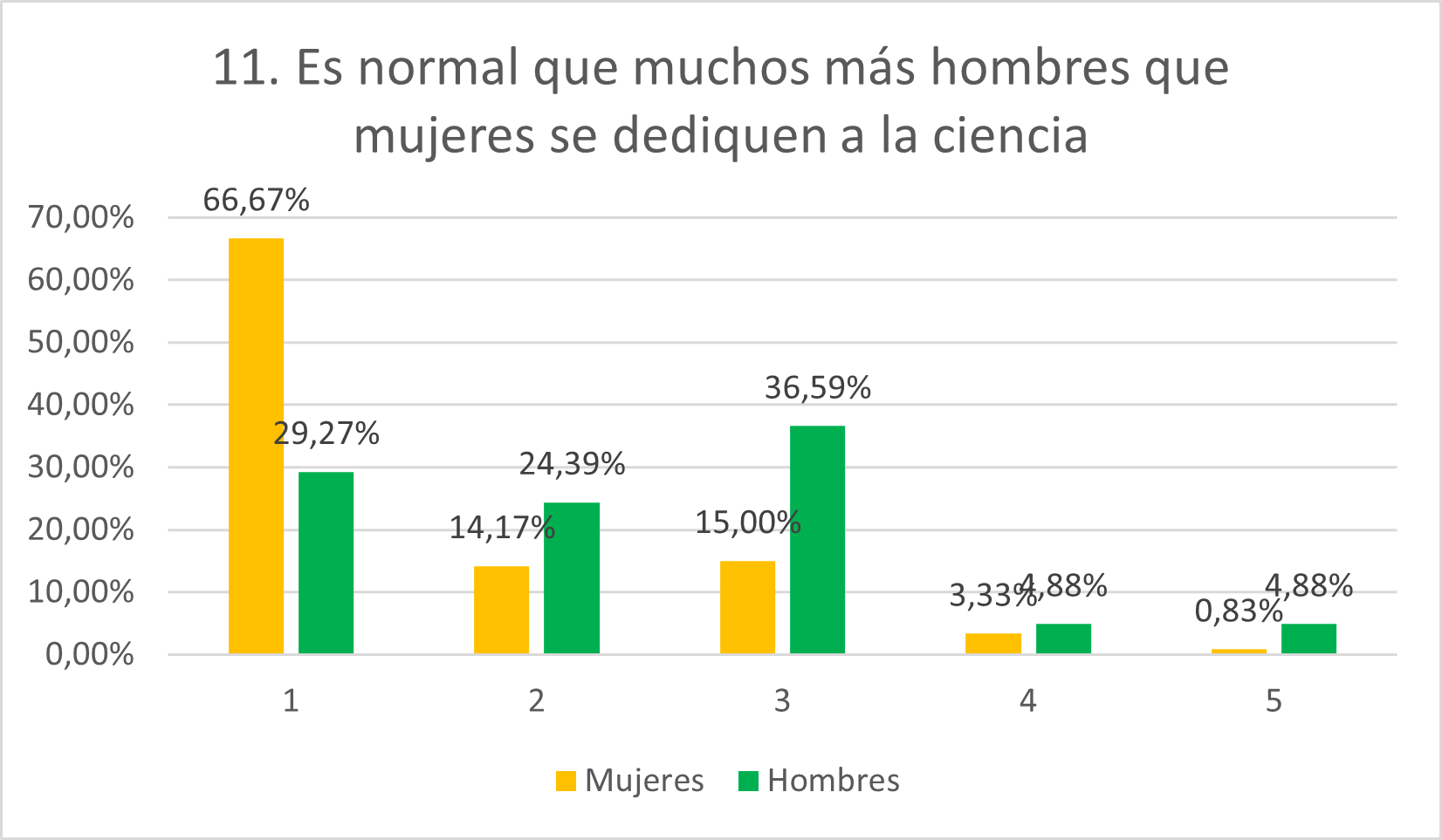 La mayoría de mujeres rechaza esta afirmación (66,67% en 1 y 14,17% en 2), dato menor entre los hombres (29,27% en 1 y 24,39% en 2), que se muestran mayoritariamente neutrales (36,59%). Esto ha sorprendido, pues se esperaba que la mayoría tendiera al desacuerdo y que la neutralidad no fuera tan alta. Esto refleja menor concienciación y mayor grado de indiferencia respecto al problema de género en el ámbito STEM entre los hombres, y mayor desencanto o voluntad de cambiarlo entre las mujeres.