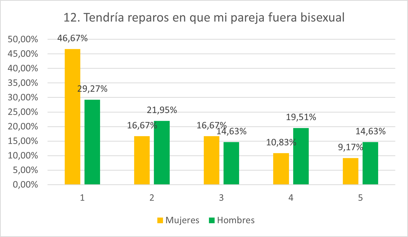 Parce confirmarse que más hombres tendrían reparos en que su pareja fuera bisexual (19,51% en 4 y 14,63% en 5; frente a 10,83% y 9,17% en las mujeres). La mayoría de mujeres (46,67%) no tendrían reparos en absoluto, frente al 29,27% de hombres. Esto confirma una mayor aceptación de la bisexualidad entre las mujeres que entre los hombres, probablemente por efecto de la masculinidad hegemónica.