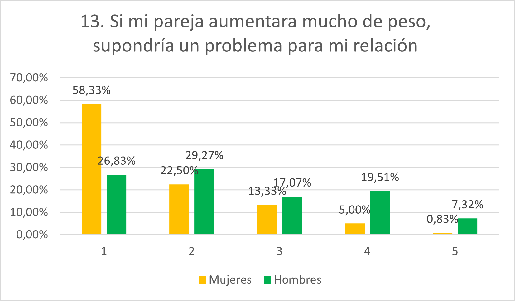 Como se esperaba, mayor porcentaje de mujeres rechaza esta afirmación (58,33% en 1 y 22,5% en 2; frente a 26,83% en 1 y 29,27% en 2 de los hombres). Casos aislados de mujeres se muestran de acuerdo con ella mientras que el 19,51% de hombres se muestra de acuerdo y el 7,32% totalmente de acuerdo. Esto refleja mayor superficialidad por parte de los hombres, que esperan en mayor grado que sus parejas encajen en los estándares de belleza.