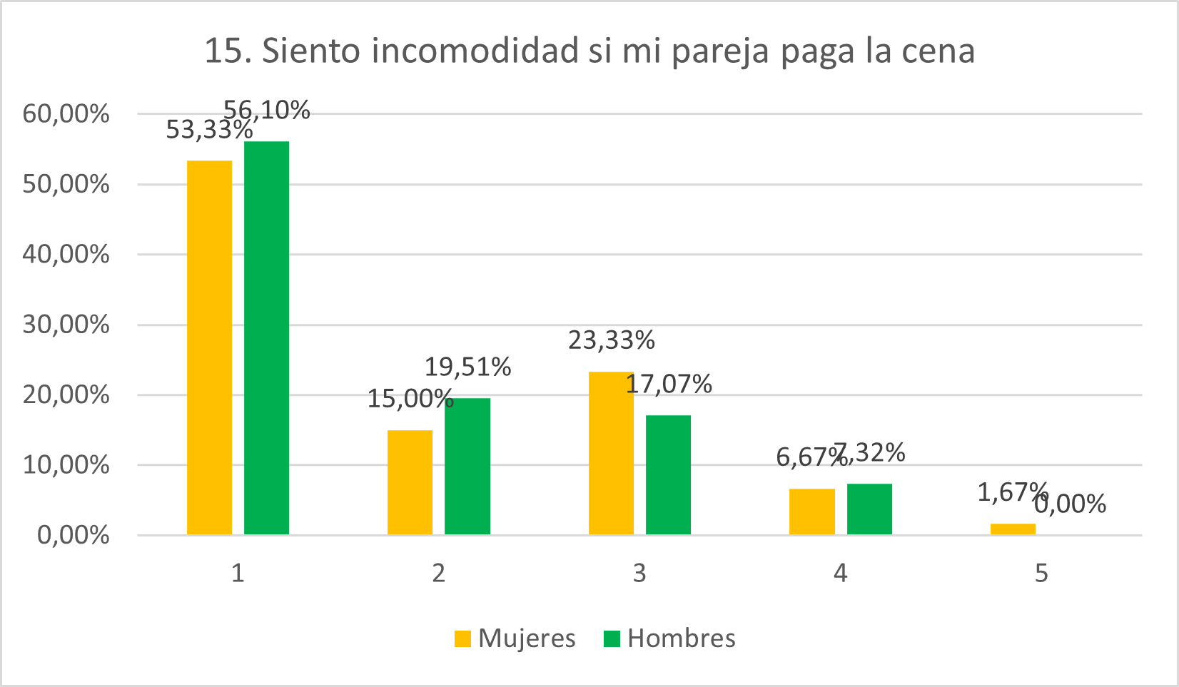 Contrariamente a lo previsto, el porcentaje de hombres que se muestra en desacuerdo (56,10%) o totalmente en desacuerdo (19,51) con esta afirmación supera al de mujeres (53,33% y 15%). Más mujeres que hombres se muestran neutrales (23,33% frente a 17,07%) y porcentajes similares se muestran en desacuerdo (6,67% de mujeres y 7,32% de hombres) o totalmente en desacuerdo (1,67% y 0%). Esto muestra un gran grado de superación de la aceptación del rol de género del hombre como proveedor económico. Las puntuaciones de las mujeres pueden reflejar rechazo a encajar en roles tradicionales de feminidad y a sentirse como trofeos.