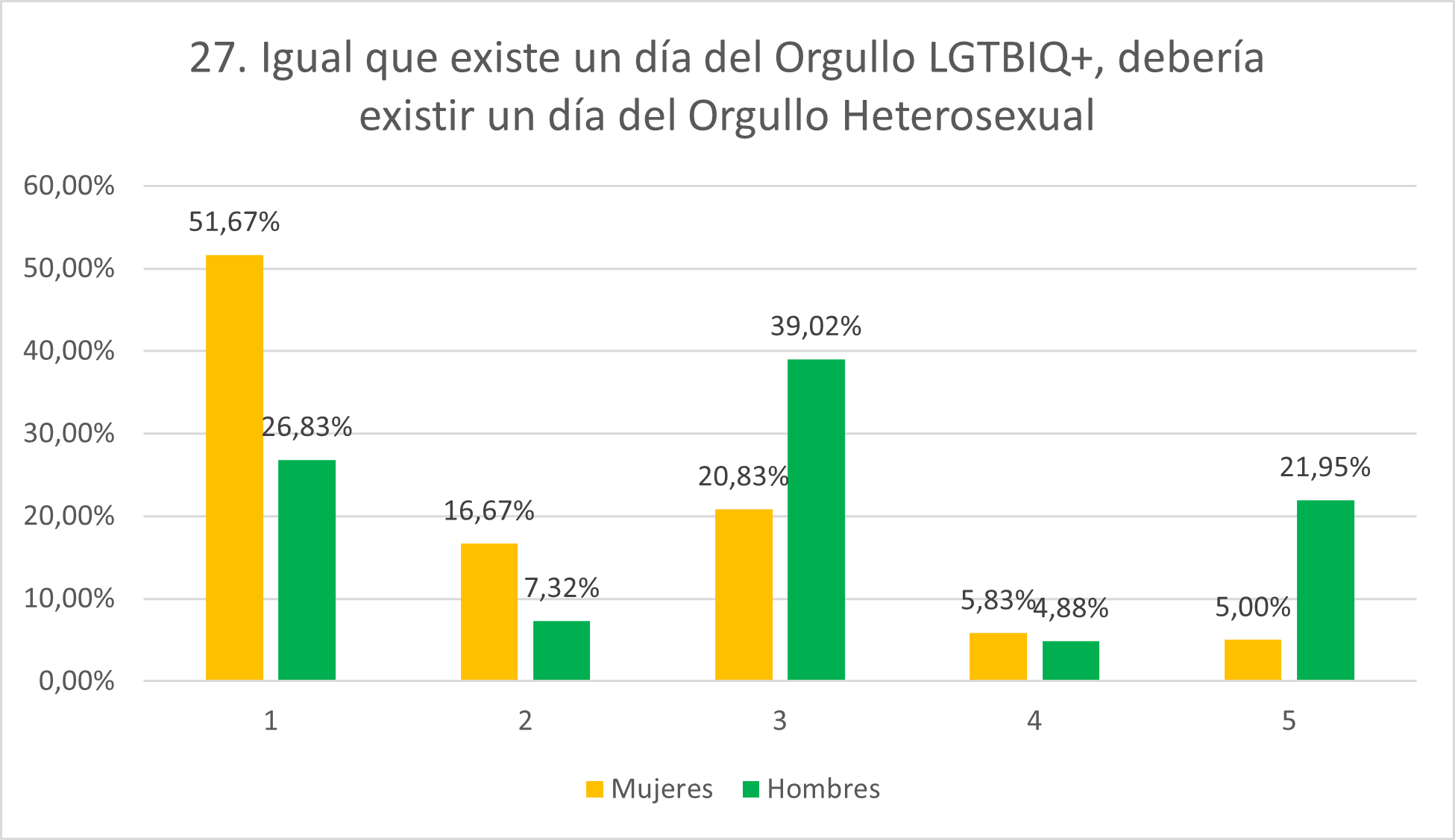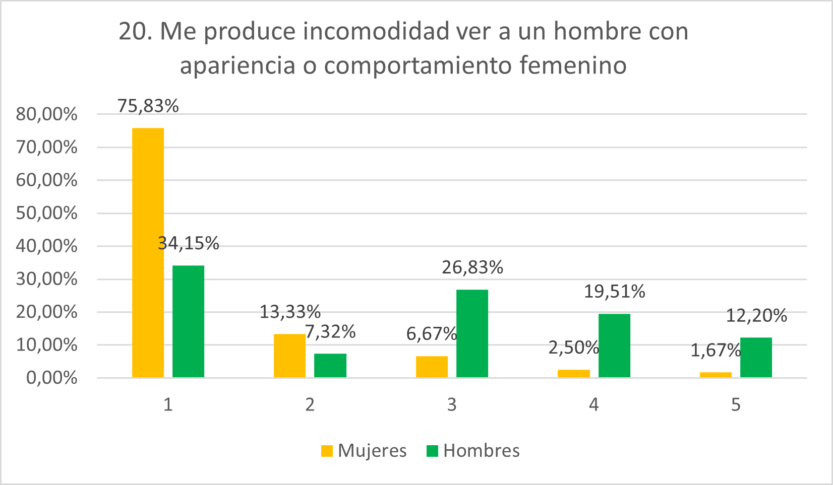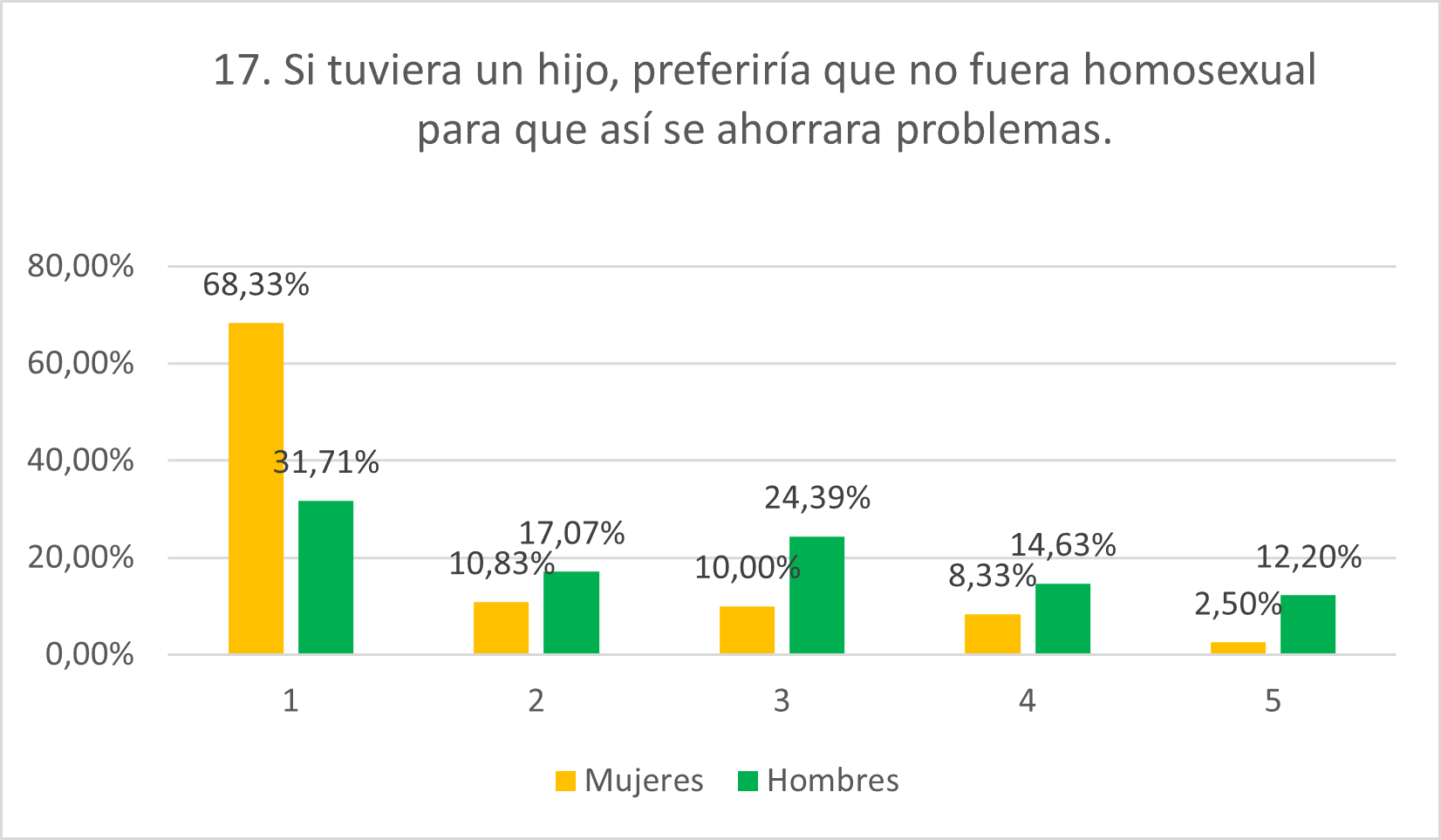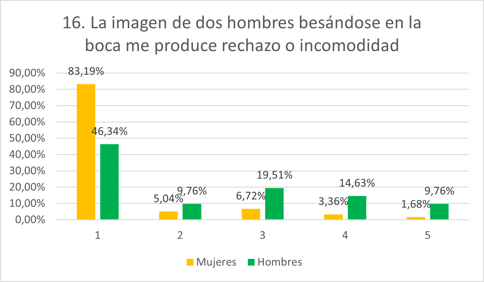 Como se esperaba, las puntuaciones de las mujeres son muy bajas mientras que los hombres exhiben mayor grado de homofobia. Mientras que el 83,19% de mujeres rechaza la afirmación categóricamente, esto solo lo hace el 46,34% de hombres. Por otro lado, mientras solamente el 3,36% de mujeres se sitúa en 4 y el 1,68% en 5, el 14,63% de hombres se posiciona en 4 y el 9,76% en 5. Además, solamente el 6,72% de mujeres se muestra neutral mientras que esto se cumple para el 19,51% de hombres.
