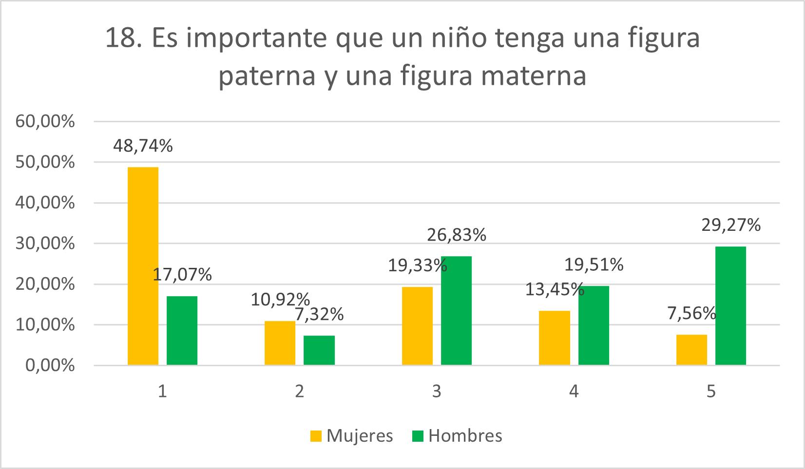 Las puntuaciones de los hombres en este ítem son muy superiores a las de las mujeres. Así, el 26,83% se muestran neutrales frente al 19,33%, el 19,51% se pronuncian de acuerdo frente al 13,45% y el 29,27% (el mayor dato entre los hombres) se declaran totalmente de acuerdo frente al 7,56% de las mujeres (el menor dato). La mayoría de las mujeres se muestran en desacuerdo (48,74% se muestran en desacuerdo total y 10,92% en desacuerdo). Sin embargo, las mujeres que se muestran neutrales o en desacuerdo son el 40,34%. Esto indica que un gran porcentaje, tanto de hombres como de mujeres, defienden la supremacía de la familia nuclear tradicional, lo cual supone, indirectamente, una invalidación de las formas de vida disidentes.
