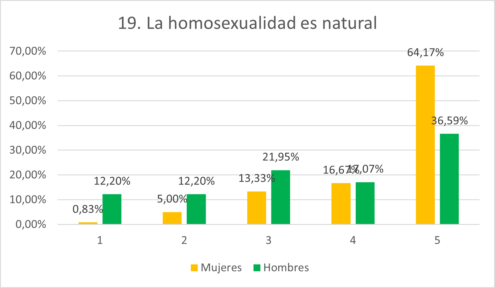 Coincidiendo con la previsión, un mayoritario 89,16% de mujeres se muestra en desacuerdo (75,83% en 1 y 13,33% en 2) mientras que este dato asciende al 41,47% en hombres (34,15% en 1 -menos de la mitad que mujeres- y 7,32% en 2). Por otro lado, el 31,71% de hombres se muestra de acuerdo con el ítem (19,51% en 4 y 12,20% en 5) mientras los casos entre las mujeres son aislados. También es muy superior el porcentaje de hombres que se muestra neutral (26,83% frente al 6,67% de mujeres). Estos datos indican homofobia en un grado mucho mayor entre los hombres que entre las mujeres, que exhiben un grado bajo.