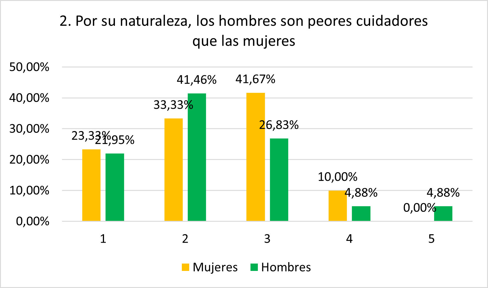 La mayoría de personas encuestadas (56,66% de mujeres y 63,41% de hombres) rechazan esta afirmación, indicando cierta superación de los roles de género femeninos asociados al cuidado. Sin embargo, llama la atención que el 41,67% de mujeres se muestra neutral, lo que refleja un grado importante de aceptación de esta norma de género. Las puntuaciones de los hombres se esperaban mayores.