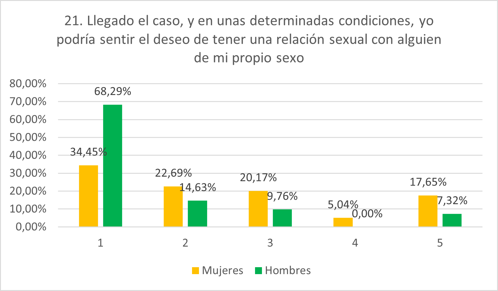 Ratificando lo hipotetizado, las puntuaciones de los hombres son menores que las de las mujeres, reflejando mayor rechazo a la idea de deconstrucción del deseo y experimentación sexual. Así, el 68,29% rechazan rotundamente la afirmación frente al 34,45% de mujeres, mientras que solamente el 7,32% se sitúan en el 5, cifra en la que se situarán los hombres gays o bisexuales que hayan respondido a la encuesta (no se ha tenido en cuenta la orientación sexual de las personas encuestadas, hecho que se tendrá en cuenta en las limitaciones del estudio). Las mujeres no se muestran tan radicales en su rechazo de las propias relaciones homosexuales, con un 22,69% en 2, un 20,17% en posición neutral y un 5,04% en 4. Un 17,65% de mujeres se sitúan en 5, pero, de nuevo, aquí entran mujeres lesbianas y bisexuales que hayan respondido a la encuesta.