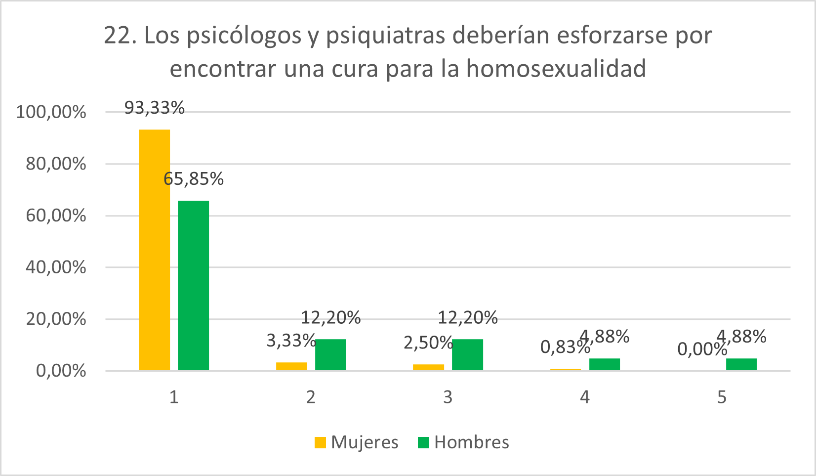 Aunque la visión patologizada de la homofobia es pequeña en general, está más presente en hombres que en mujeres. La grandísima mayoría de mujeres (93,33%) se muestran en contra de esta afirmación. Por su parte, los hombres no expresan un rechazo tan radical, situándose en 1 el 65,85% de los mismos. Mientras que las mujeres en posición neutral o de acuerdo con el ítem son aisladas (2,50% en 3, 0,83% en 4 y 0% en 5), los hombres muestran mayor grado en estas posiciones (12,20% en 3, 4,88% en 4 y 4,88% en 5).