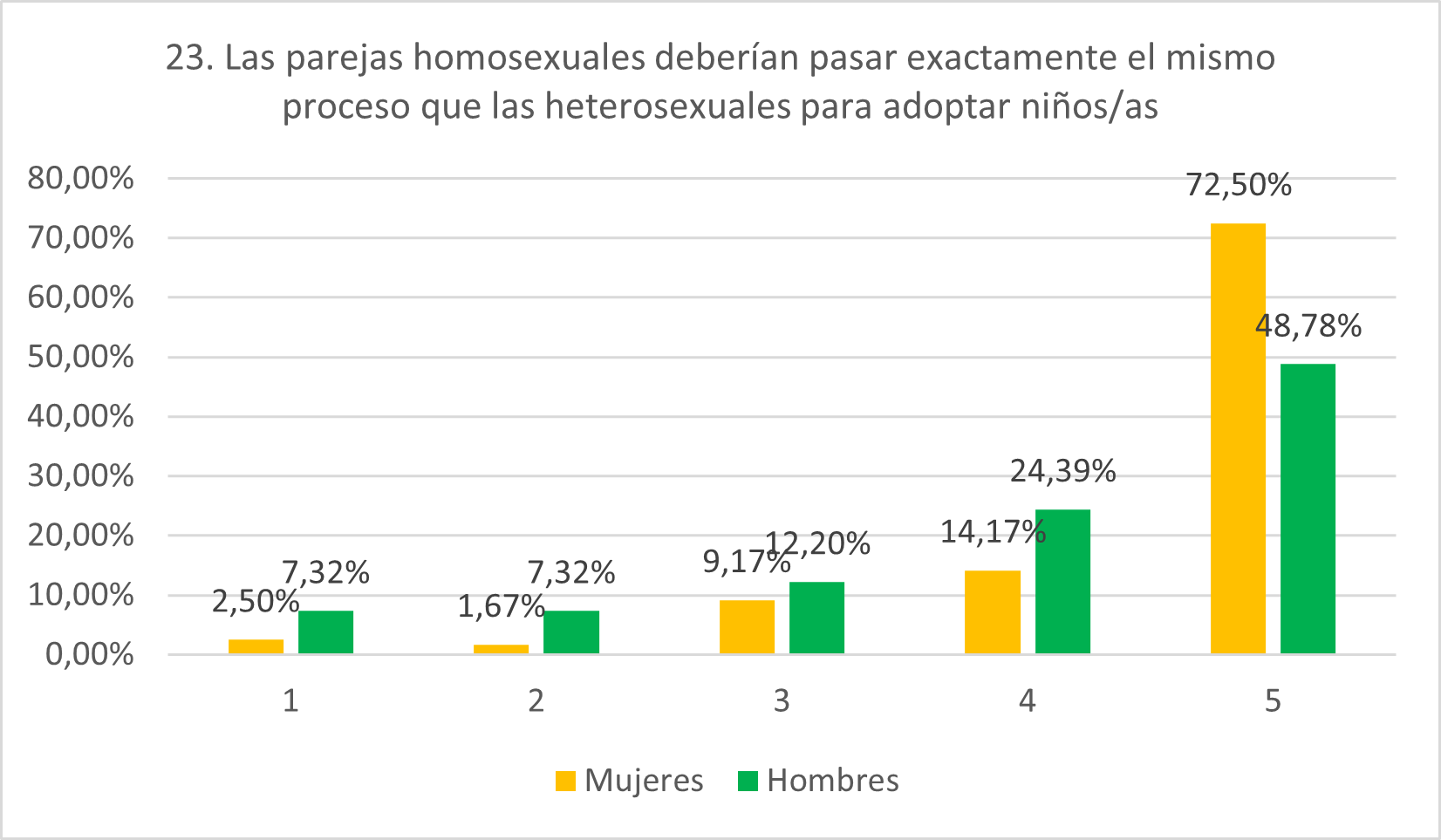 Se partía de la hipótesis de que el grado de aceptación de este ítem fuera alto y así es, con el 86,67% de mujeres de acuerdo (14,17% en 4 y 72,50% en 5) y el 73,17% de hombres (24,39% en 4 y 48,78% en 5), aunque los hombres no expresan una avenencia tan contundente como las mujeres, lo cual también se esperaba. Porcentajes muy bajos indican estar de acuerdo: 2,50% en 1 y 1,67% en 2 para las mujeres y 7,32% en 1 y 7,32% en 2 para los hombres. Pero, de nuevo, se observa que los hombres exhiben mayor grado de homofobia, en este caso ante la idea de parejas homosexuales adoptando niños.