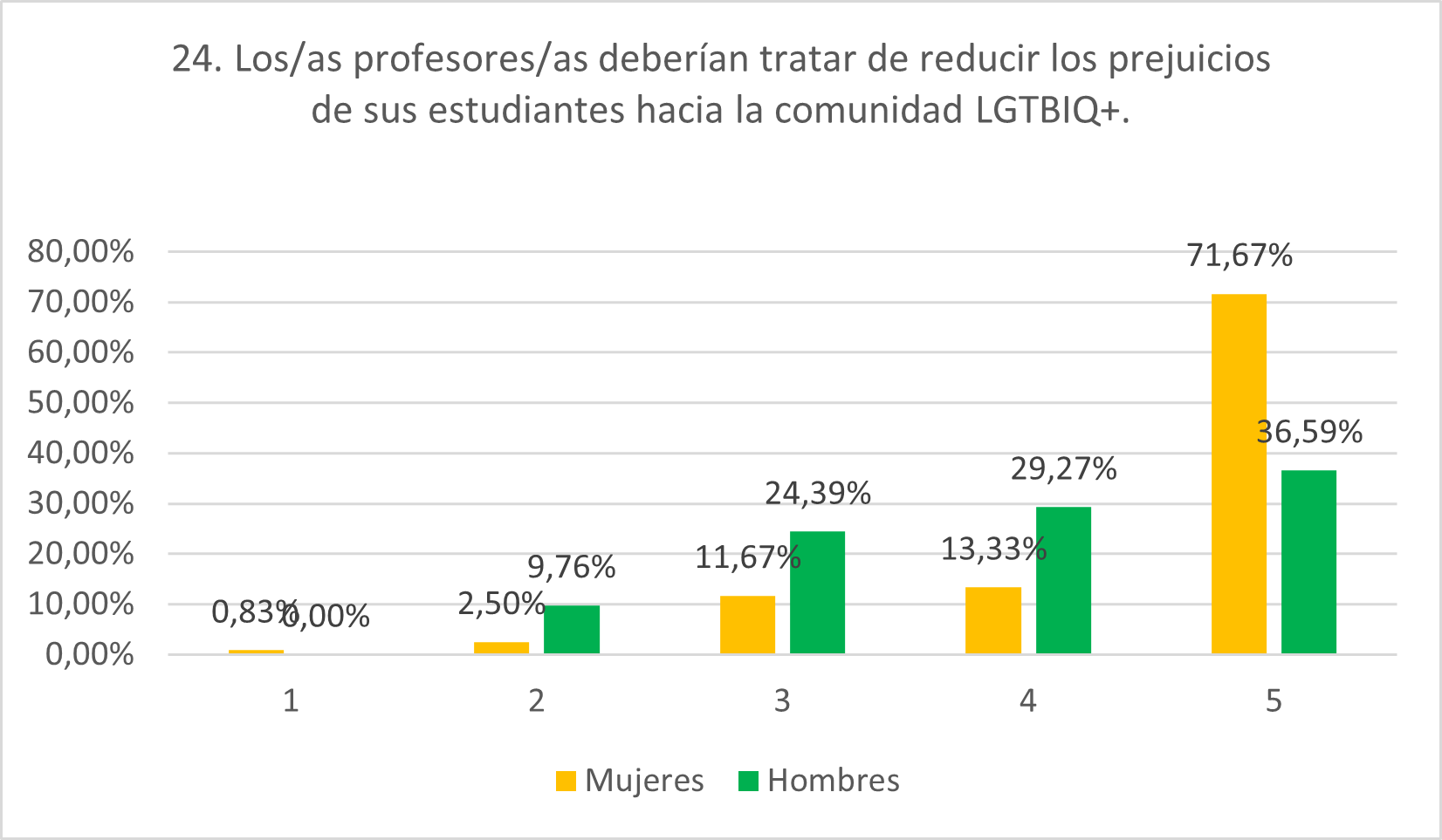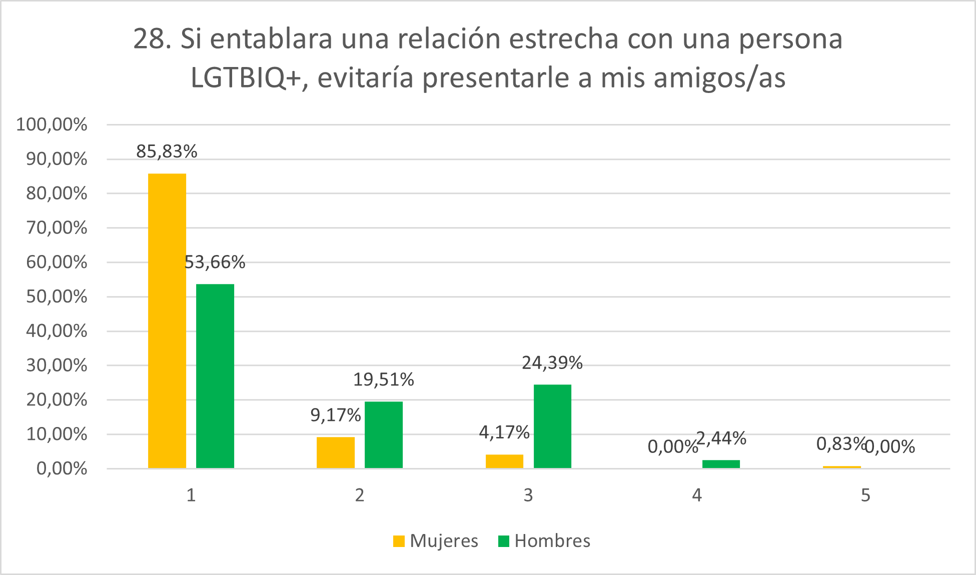 Las mujeres expresan disposición mayoritaria a reprender comentarios LGTBIfóbicos, con un 24,17% en 4 y un 50,83% en 5 y casos aislados en 1 y 2. Los hombres, por el contrario, exhiben mayoritariamente una actitud de neutralidad (31,71%), igual porcentaje que el de los que se muestran de acuerdo con la afirmación (19,51% en 4 y 12,20% en 5). Un 36,59% de hombres guardaría silencio al presenciar actitudes LGTBIfóbicas (12,20% en 1 y 24,39% en 2). Esto indica que los hombres no se atreven tanto como las mujeres a desafiar a sus amigos en cuanto a defender a minorías de género.