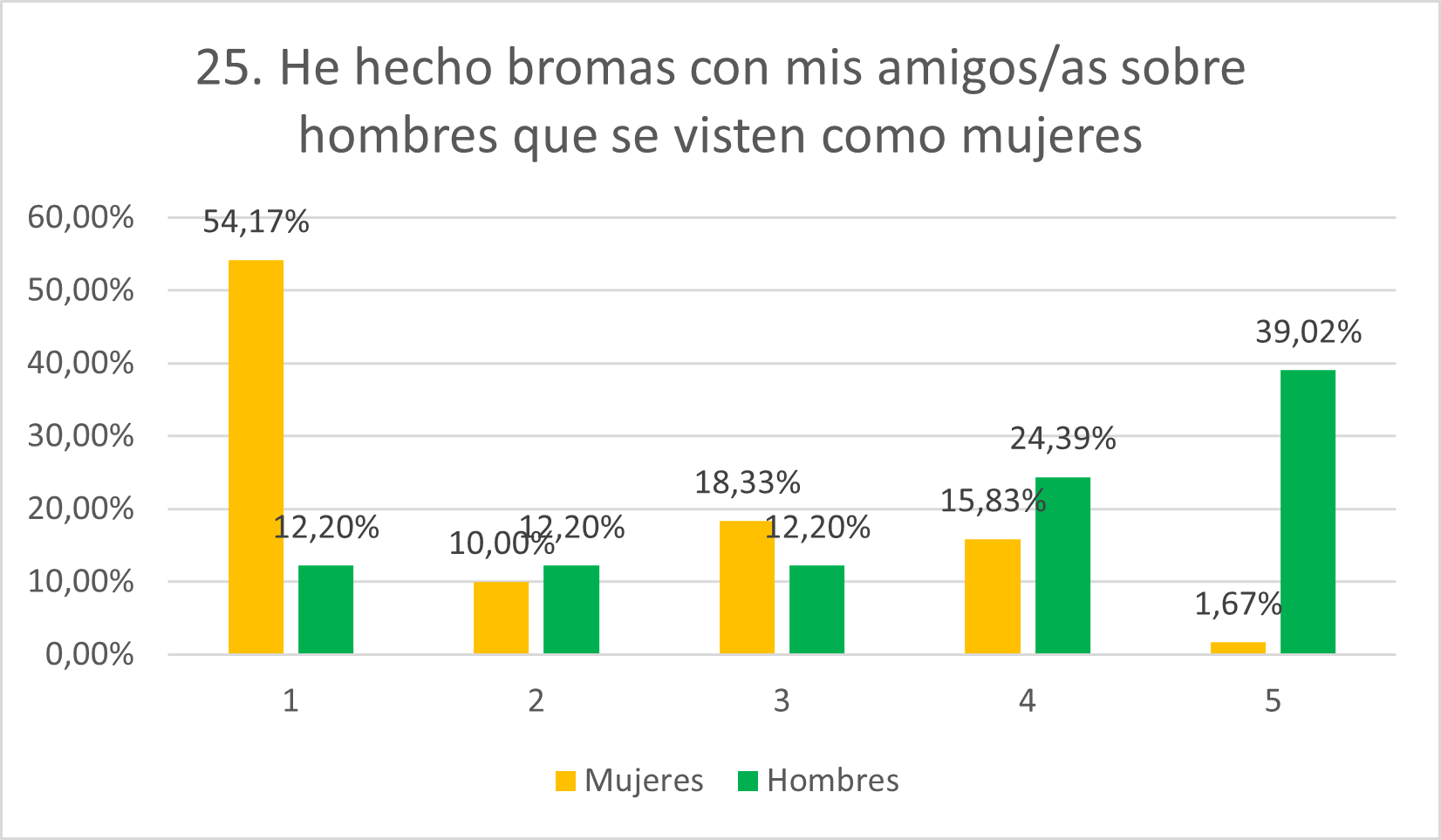 Las puntuaciones de hombres y mujeres en este ítem se sitúan de forma contraria. Mientras que la mayoría de mujeres indican total desacuerdo con la afirmación (54,17%), solamente el 12,20% de hombres expresa lo mismo. Sin embargo, mientras que los casos de mujeres que están totalmente de acuerdo son aislados, los de hombres ascienden al 39,02%. Además, en 4 también se sitúa un porcentaje grande de hombres (24,39%). De este modo, el 64,12% de mujeres se sitúa en 1 y 2 mientras el 63,41% de hombres lo hace en 4 y 5. Esto muestra actitudes antitéticas respecto a la ridiculización de la feminidad en hombres. La mayoría de mujeres rechaza esta actitud mientras que la mayoría de hombres confiesa haberla perpetrado.
