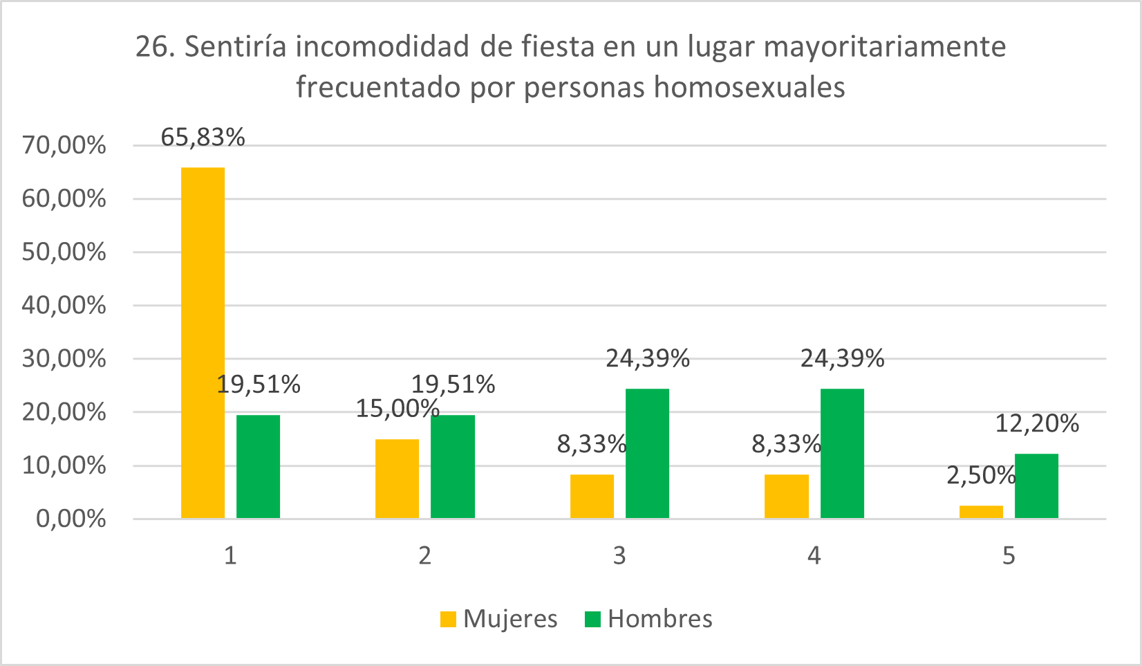 La mayoría de mujeres (65,83%) está totalmente en desacuerdo con esto, lo que probablemente se deba a que los locales de ambiente suelen verse como un espacio seguro para mujeres. Sin embargo, a pesar de se preveía que las puntuaciones de los hombres fueran algo mayores, se partía de la hipótesis de que fueran más similares a las de las mujeres de lo obtenido. El 24,39% de hombres expresa acuerdo con la afirmación y el 12,20% total acuerdo, siendo mayores los porcentajes que indican incomodidad (19,51% en 1 y 19,51% en 2), lo que reafirma el mayor grado de homofobia entre los hombres.