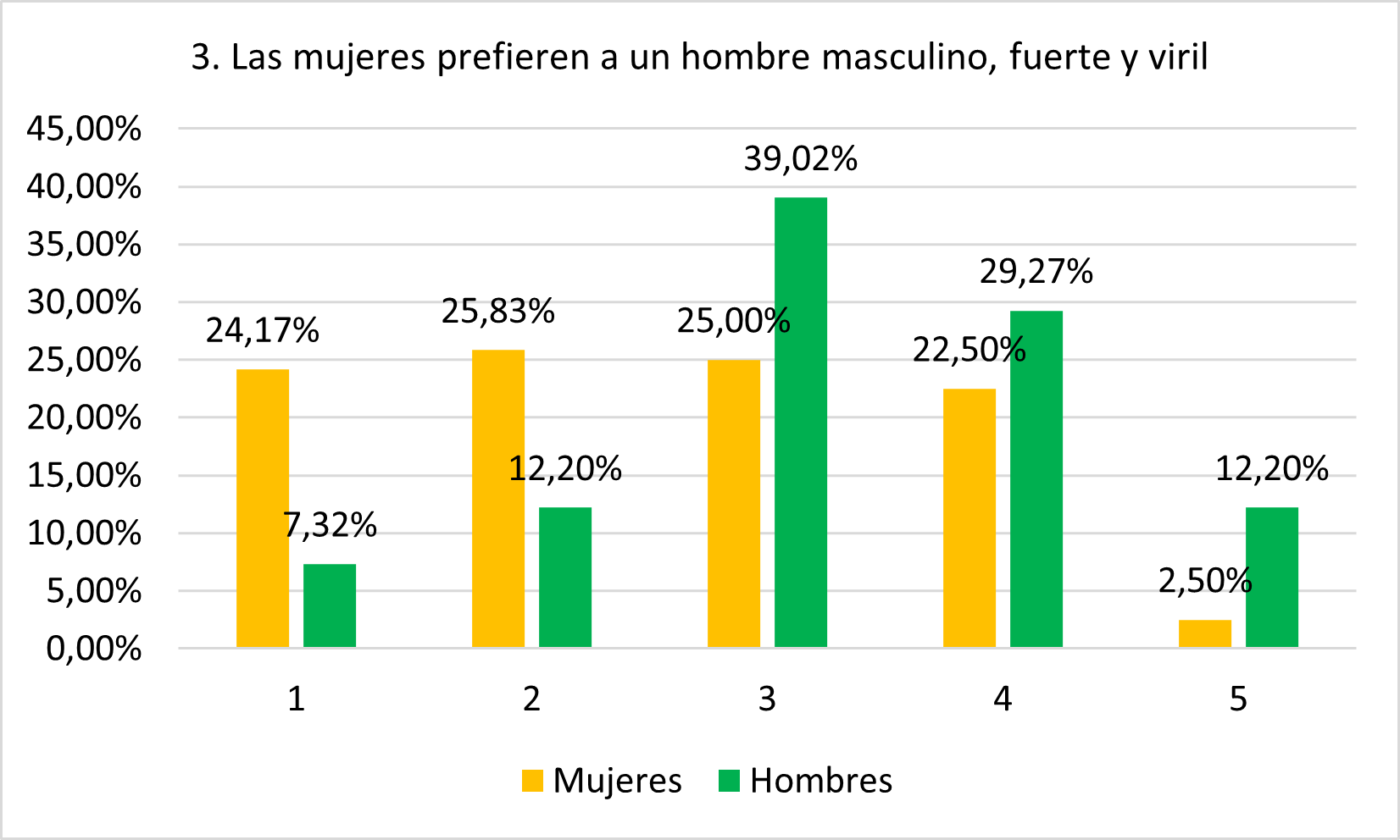 Las respuestas de las mujeres están repartidas casi de forma uniforme entre todos los niveles a excepción del total de acuerdo. Esto refleja que no hay una tendencia general a reconocer o a rechazar la posición superior de la masculinidad hegemónica dentro de los esquemas de deseo, aunque es cierto que no se acepta radicalmente. Sin embargo, la mayoría de hombres (41,47% en 4 o 5) está de acuerdo, reflejando el fuerte arraigo de la masculinidad hegemónica en la población masculina. Muchos de ellos (39,02%) se mantienen neutrales.