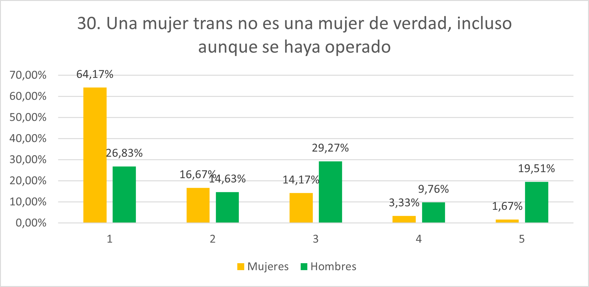 Como se esperaba, la mayoría de mujeres están en desacuerdo con esta afirmación (64,17% en 1 y 16,67% en 2). Los hombres, en su mayoría, se sitúan en la neutralidad (29,27%) y, mientras que muchos de ellos están en desacuerdo (26,83% en 1 y 14,63% en 2), un número considerable de ellos se declaran de acuerdo (9,76% en 4 y 19,51% en 5 frente a los 3,33% en 4 y 1,67% en 5 de las mujeres). Esto indica un nivel alto de aceptación de las realidades trans entre las mujeres, pero mucho más bajo entre los hombres. Aunque las puntuaciones de los hombres se esperaban menos neutrales y más altas.