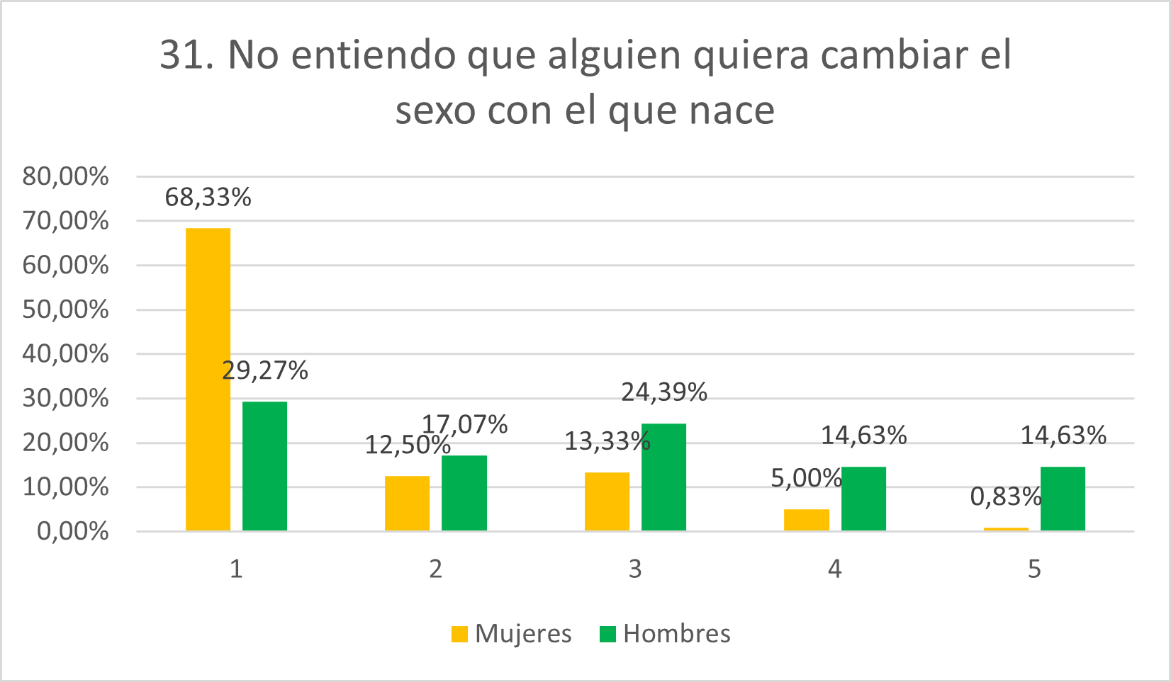 En línea con el anterior ítem, se tiene que la gran mayoría de mujeres se muestra en desacuerdo con este (68,33% en 1 y 12,50% en 2) mientras que casos aislados se declaran de acuerdo. Sin embargo, mayores niveles de hombres se muestran de acuerdo (14,63% en 4 y 14,63% en 5), mientras que un 29,27% se muestra en rotundo desacuerdo y un 17,07% en desacuerdo. Como se puede observar, los gráficos de este ítem y el anterior son similares, lo que refuerza la idea de que el nivel de aceptación de las realidades trans entre las mujeres es mayor que entre los hombres.