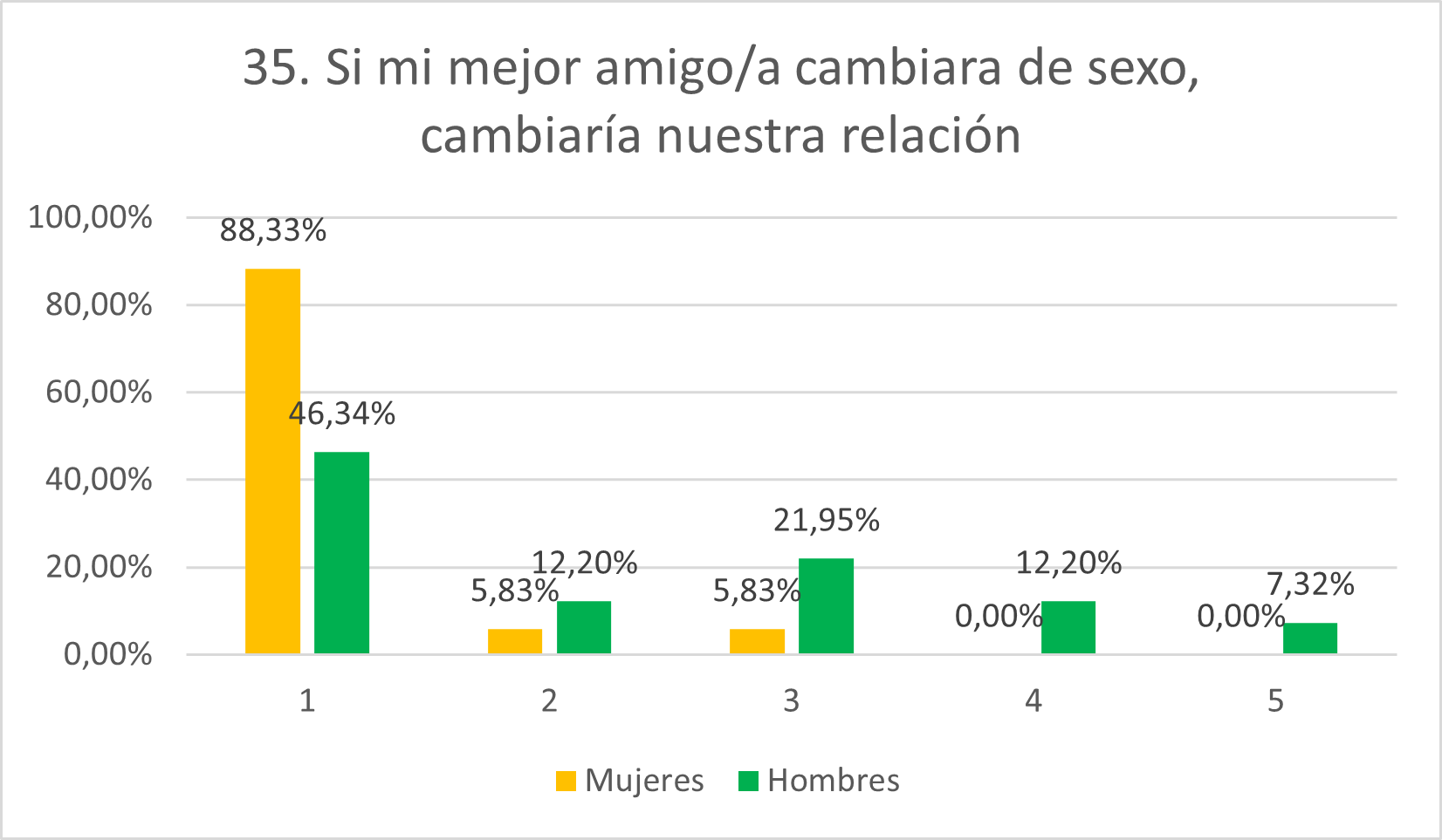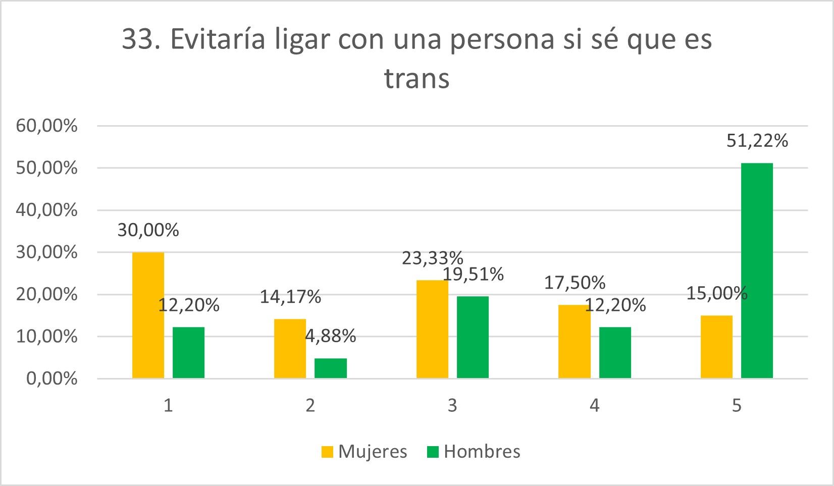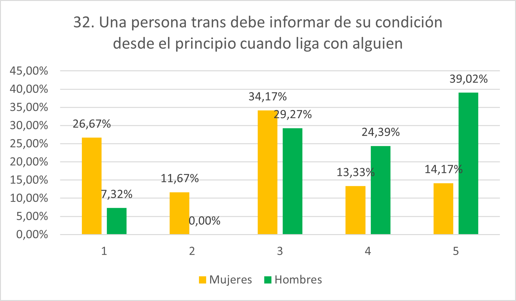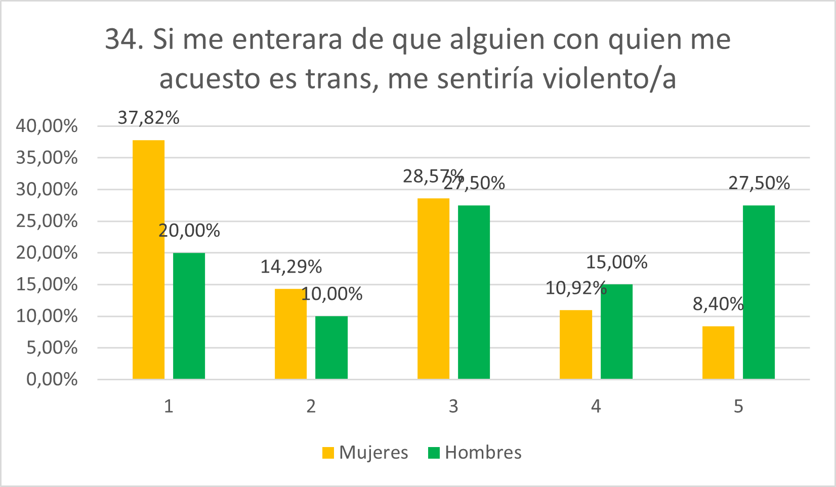 Ya que se preveía menos rechazo por parte de las mujeres ante estar con una persona trans, también se esperaba menor nivel de avenencia con esta afirmación, pero, aunque se esperaba que las puntuaciones en general fueran altas, la realidad es que la gran mayoría se ha mostrado en desacuerdo (37,82% en 1 y 14,29% en 2). Los hombres, por su parte y también como se esperaba, se muestran de acuerdo con el ítem, situándose el 15% en 4 y el 27,50% en 5. De nuevo, los porcentajes tanto de hombres como de mujeres que se sitúan en una posición neutral son altos (28,57% para mujeres y 27,50% para hombres). Llama la atención el hecho de que un porcentaje similar se muestre neutral pero el resto de respuestas sean simétricas, estando la mayoría del resto de mujeres en 1 y 2 y la mayoría del resto de hombres en 4 y 5.