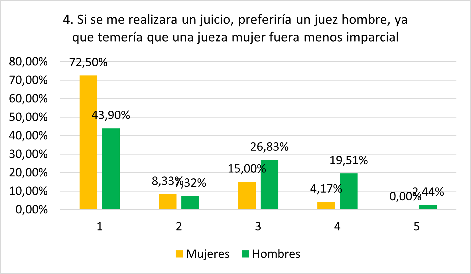 4. Si se me realizara un juicio, preferiría un juez hombre, ya que temería que una jueza mujer fuera menos imparcial.