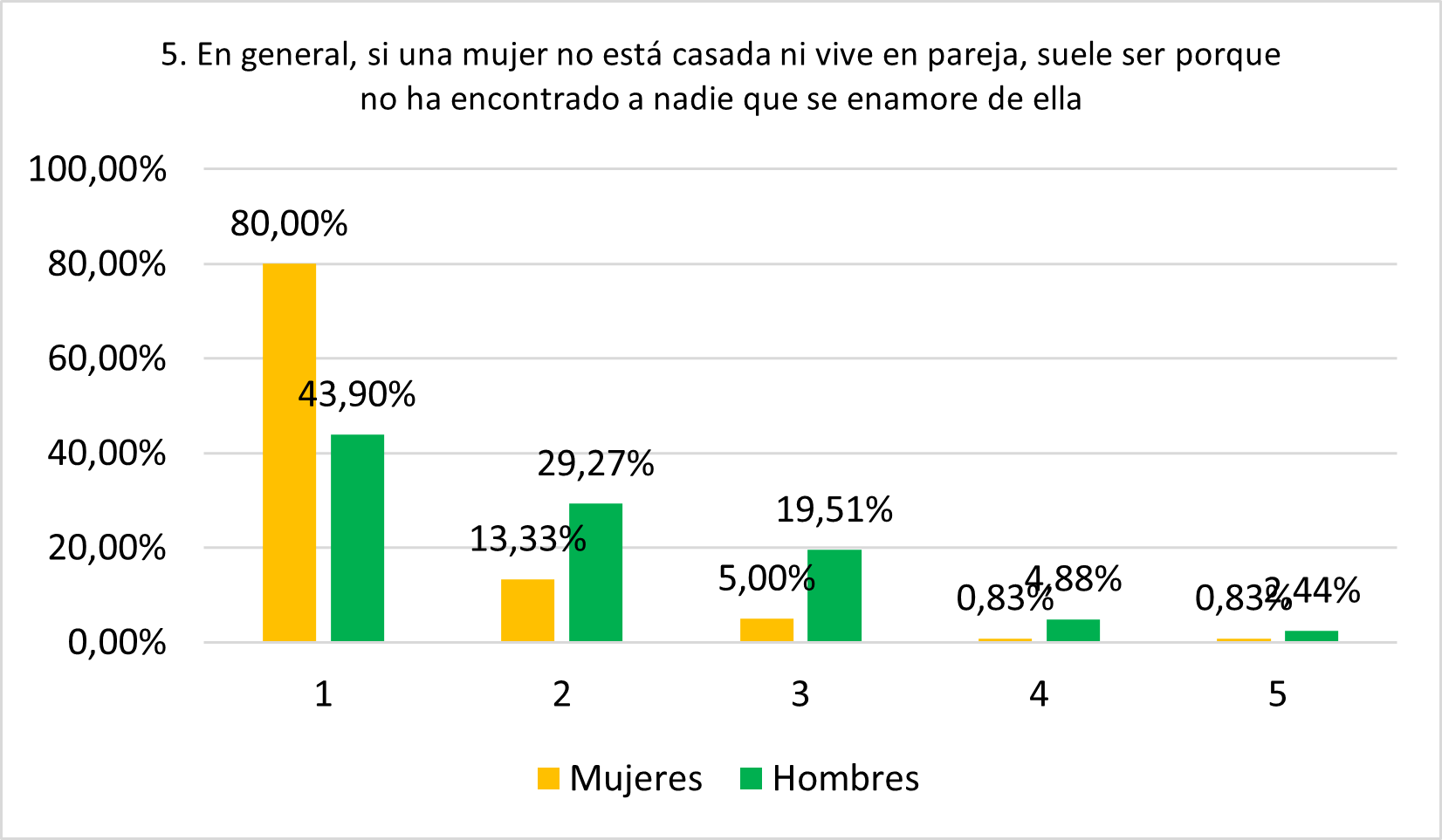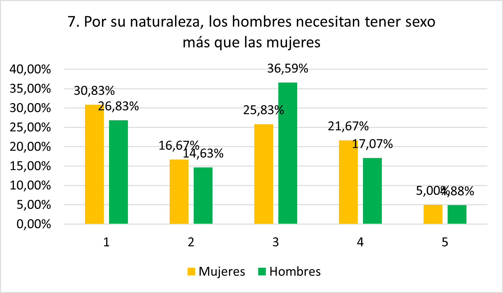 Contrariamente a lo esperado, esta afirmación parece rechazarse por parte tanto de hombres (41,46% en 1 y 2) como de mujeres (47,5% en 1 y 2). Sin embargo, muchas y muchos se muestran neutrales (25,83% de mujeres y 36,59% de hombres), aunque muy pocas personas están totalmente de acuerdo (5% de mujeres y 4,88% de hombres).