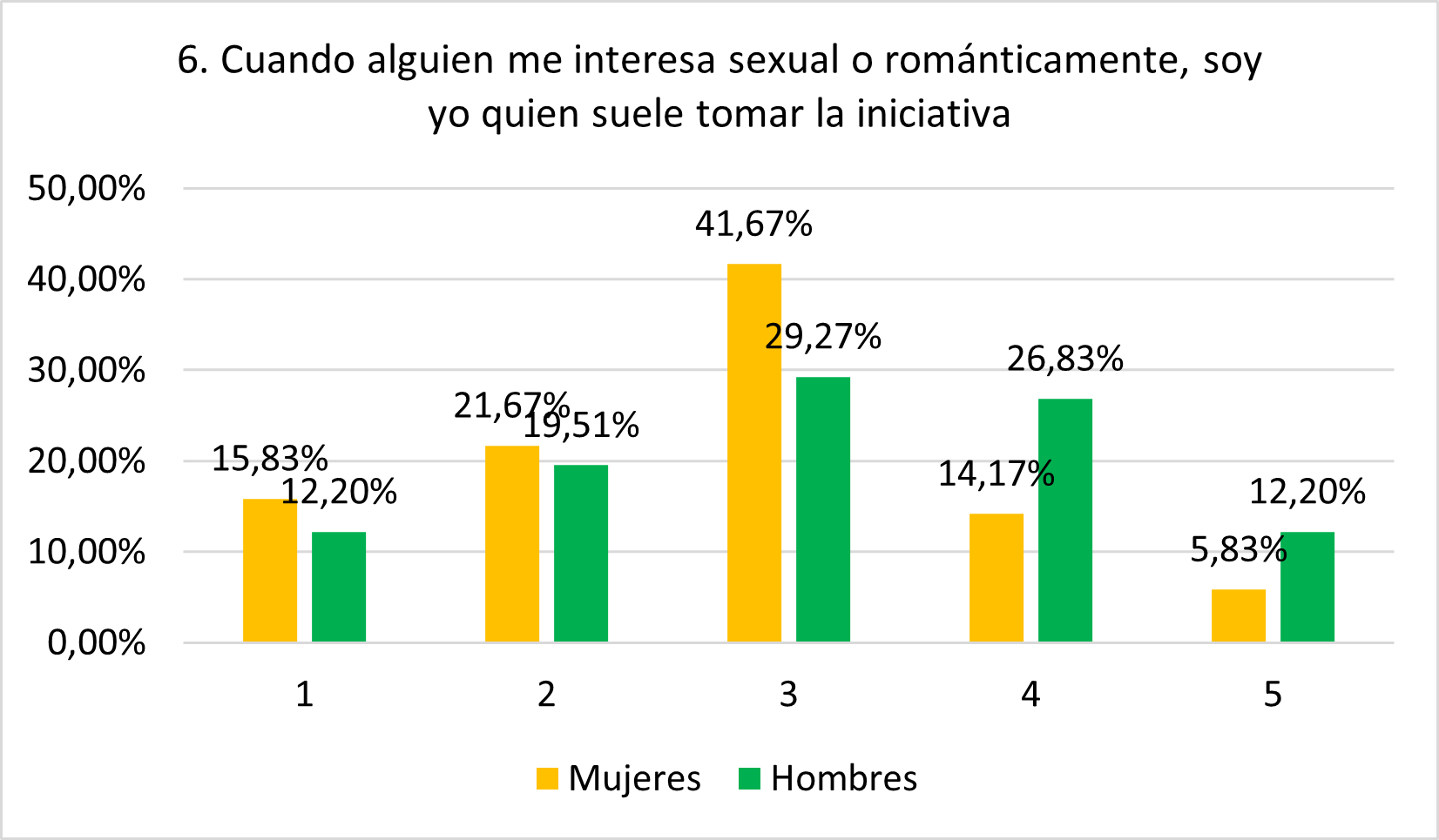 Coincidiendo con la hipótesis, las puntuaciones entre los hombres son mayores, con el 39,03% mostrando iniciativa frente al 20% de mujeres. Esto confirma el papel más pasivo de las mujeres en cuanto a acercamientos románticos y sexuales. Sin embargo, el 31,71% de hombres se muestra en desacuerdo total o parcial, dato que se esperaba menor. También se esperaba que las puntuaciones de las mujeres fueran menores aún.