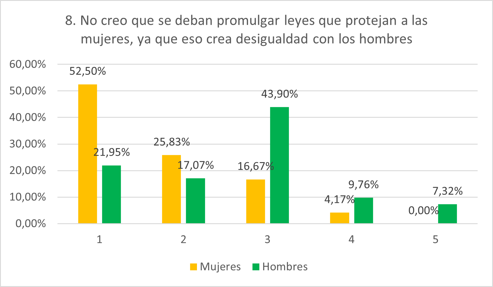 Como se esperaba, la mayoría de mujeres está en desacuerdo con esta afirmación (78,33% en 1 y 2 y 4,17% en 4 y 5). También como se esperaba, la tendencia de los hombres es diferente; casi la mitad de ellos se muestran neutrales (43,90%) mientras que el 17,08% están de acuerdo. Esto refleja menor concienciación de la situación de las mujeres como grupo vulnerable entre los hombres que entre las mujeres.