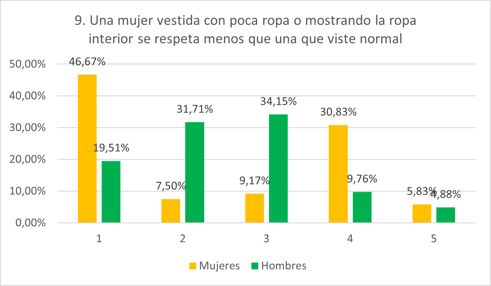 La respuesta de las mujeres no es tan baja como se preveía y muestra cierto grado de polarización, con muchas estando de acuerdo y muchas estando en desacuerdo (46,67% y 7,50% en 1 y 2. 30,83% y 5,83% en 4 y 5). Los hombres muestran una actitud más neutral (34,15% en 3) o tienden al rechazo de la afirmación (19,51% en 1 y 31,71% en 2). Esto refleja, sorprendentemente con respecto a lo que se hipotetizaba, un grado de misoginia respecto a la vestimenta mayor entre las mujeres que entre los hombres.