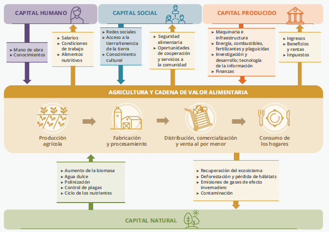 Capital Social: Engloba las políticas, regulaciones, instituciones (incluidas las que participan en la formulación de políticas y la organización de mercados), culturas y tradiciones que inciden en el cultivo, el procesamiento, la distribución y el consumo de alimentos. También incluye el poder de las empresas privadas y la política del conocimiento que influyen en la gobernanza de los sistemas agroalimentarios. El capital social no genera ingresos por sí solo, pero en su ausencia, los otros tres capitales son menos eficaces para generar ingresos y, por tanto, pueden perder valor.